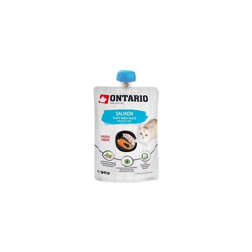 A treat for cats - Ontario Salmon Fresh Meat Paste. Delicious, fresh salmon and chicken meat paste for adult cats. Reasons why your cat will love the tasty Ontario Meat Paste: Fresh meat paste and quality broth is an irresistible treat created for every cat The paste is suitable as an extra treat between meals and on the go. The packaging with a practical closure retains taste and freshness even after reopening. Helps your pet to increase its fluid intake with daily nutrition. Your cat's heart, eyesight, skin, coat and immunity will get what they need from the added taurine and vitamins A, D3, E and B (B2, B3, B5). Ingredients: chicken broth 79.23%, salmon 14.076%, chicken 3.62%, starch 2%, xanthan gum 0.4%, salt 0.4%, bonito fish flavour 0.1%, isomaltose 0.08%, taurine 0.08%, tea extract 0.008%, vitamins (A, B2, B3, B5, D3, E, polydextrose) 0.006%. Analytical constituents: crude protein 2,5%, oils and fats 0,1%, crude fibre 1%, crude ash 1,2%, moisture 90%