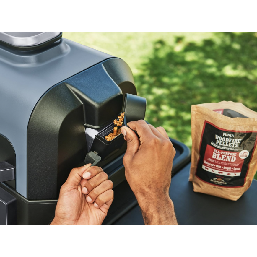 КОМПЛЕКТАЦИЯ: Гриль Ninja Woodfire Pro Connect XL BBQ (европейская вилка), цифровой зонд, коробка для копчения, корзина для жарки, решетка для гриля, поддон для жира и защитный вкладыш, два стартовых набора древесных гранул, мерная ложка. Вес: 18 кг. Цвет: черный.