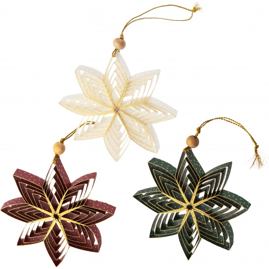 The Enne Claudia Christmas tree decoration set contains a total of six beautiful paper stars in three different colors. The colors of the stars are off-white, burgundy and dark green. With star decorations, you bring a wonderful Christmas atmosphere to your home, or you can use stars instead