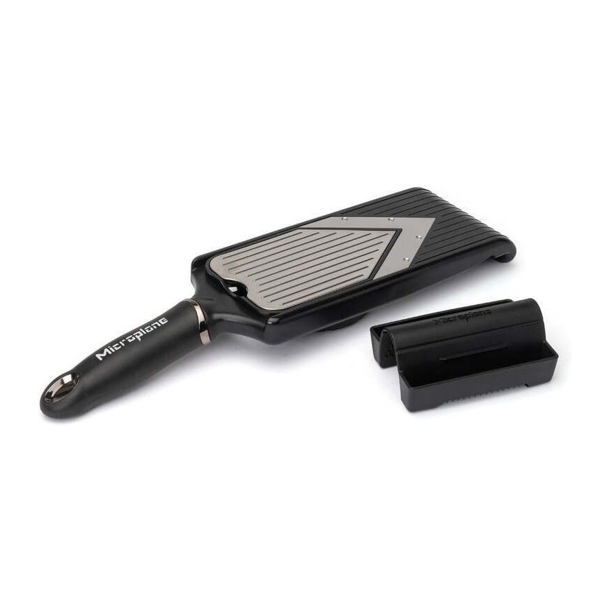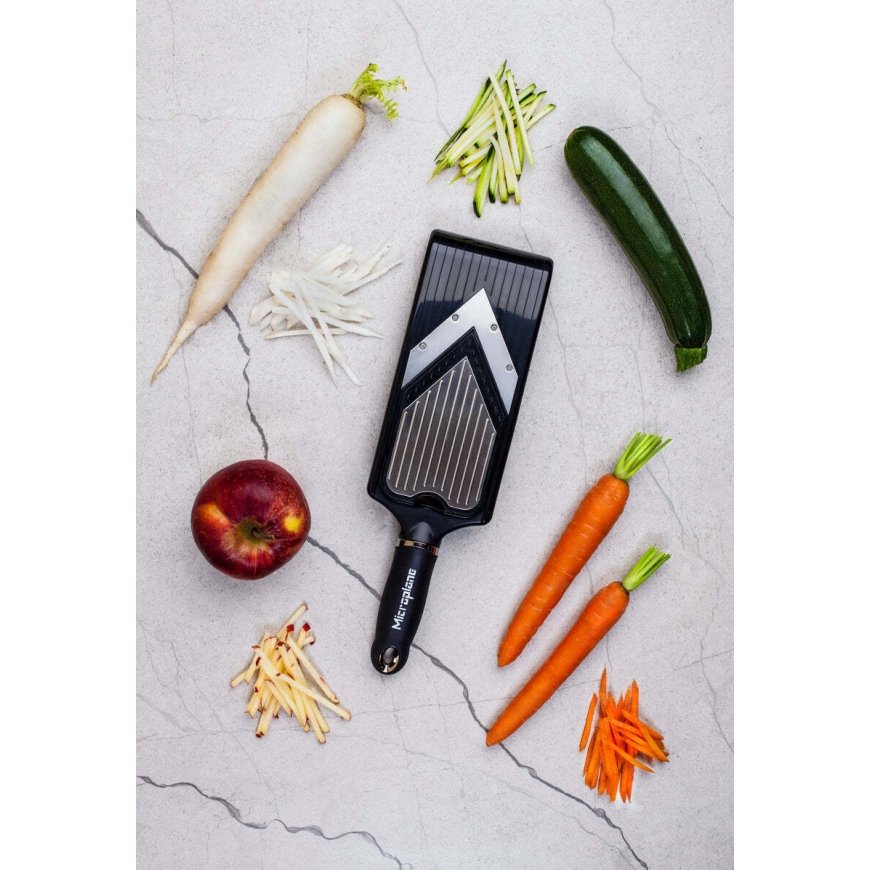 With the Microplane V-Slicer Julienne mandolin, you bring a touch of beauty and practicality to cooking. The V-blade mandolin has durable and sharp blades with adjustable features. Slice fruits and vegetables with a manual mandoline