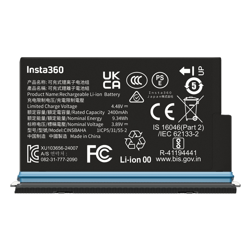 Insta360 X5 Battery. Тип продукта: Батарея камеры, Совместимость c брэндом: Insta360, Цвет товара: Черный. Вес: 130 g, Ширина упаковки: 85 mm, Глубина упаковки: 119 mm. Емкость батареи: 2400 mAh, Емкость батареи: 9,34 Wh, Напряжение батареи: 3,89 V