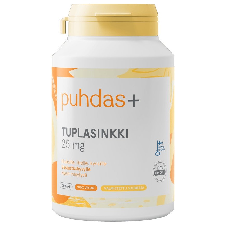 Puhdas+ Tuplasinkki is a highly absorbable vegan zinc supplement. The plant-based capsule contains two highly absorbable forms of zinc: zinc gluconate and zinc picolinate.