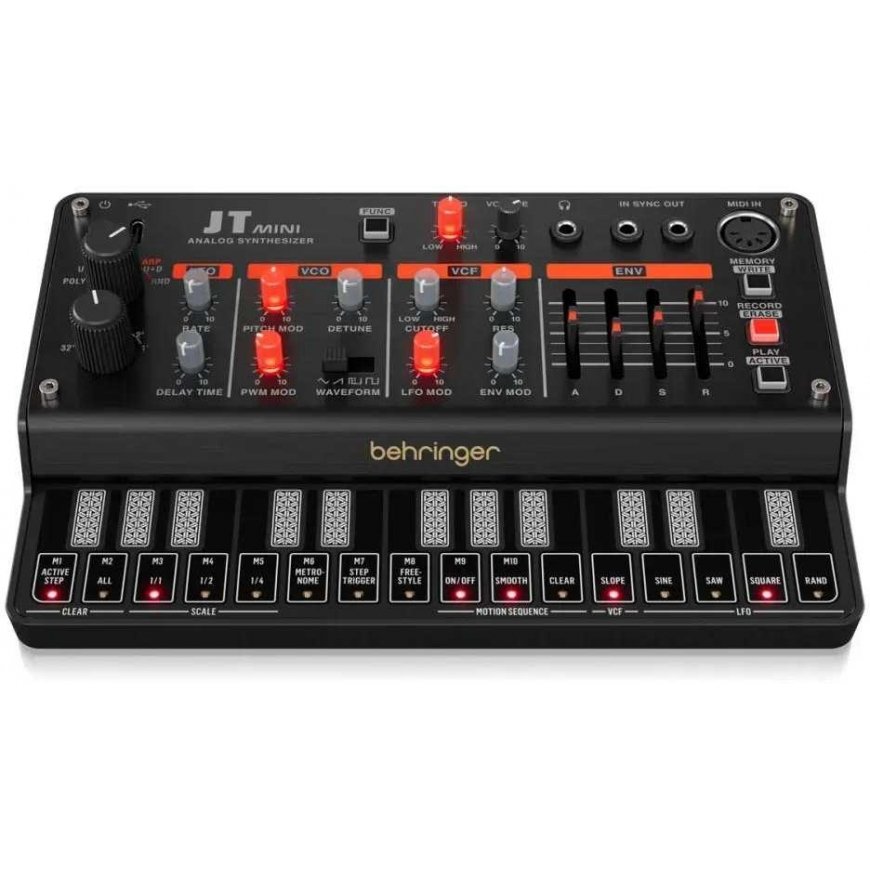 „Behringer JT MINI“ – портативный аналоговый полифонический синтезатор с 3 VCO, многорежимным VCF фильтром, арпеджиатором и 16-ступенчатым секвенсором. Основные характеристики: программируемый полифонический аналоговый синтезатор; дизайн, вдохновленный классической моделью „Jupiter“ из 80-х; 27 чувствительных к касанию клавиш; полностью аналоговый звуковой путь, основанный на аутентичных решениях VCO, VCF и VCA; VCO осциллятор с 4 переключаемыми режимами формы волны: „Saw“ / „Triangle“ / „Square“ / „Pulse“; модуляция ширины импульса предлагает дополнительную звуковую палитру; классический фильтр с несколькими режимами и управлением резонансом; 16-ступенчатый секвенсор с 8 слотами памяти и возможностью сохранения движений ручек; LFO фильтр с режимами „Saw“ / „Triangle“ / „Square“ / случайной формы для эффектов вибрато, тремоло и вокального фильтра (wah); VCA с специально разработанным ADSR фильтром; USB-C разъем для питания от компьютера, смартфона или внешнего аккумулятора; входные и выходные разъемы синхронизации для синхронизации с другими инструментами; полная установка MIDI (включая управление CC, все возможные параметры и функции LOAD/SAVE).