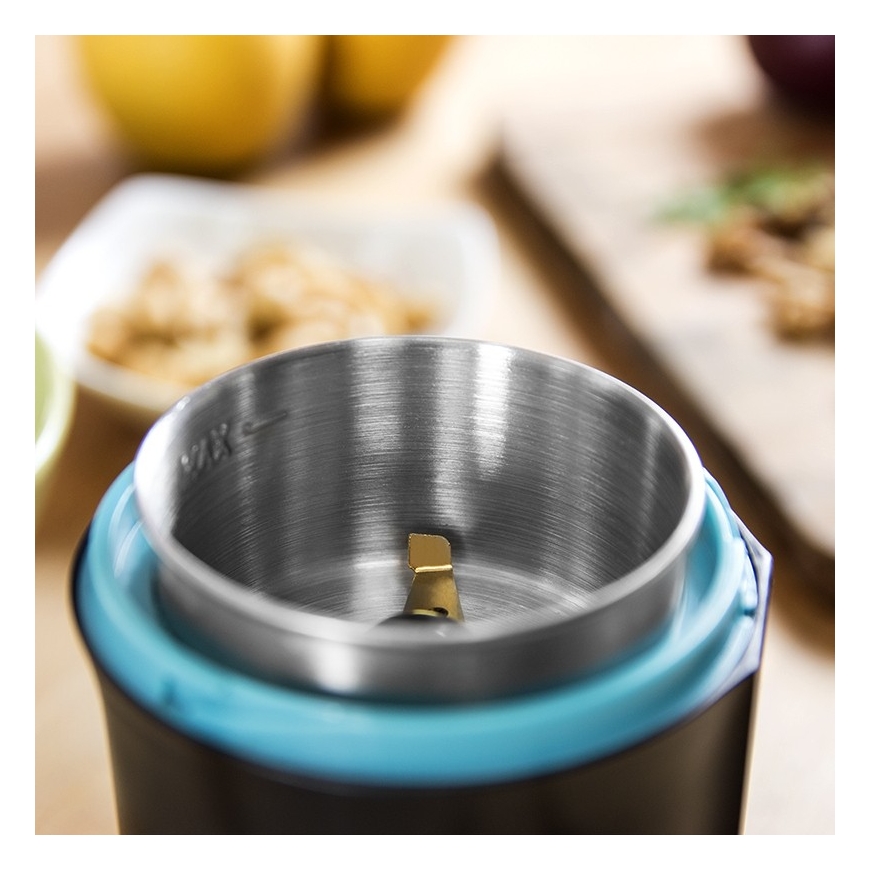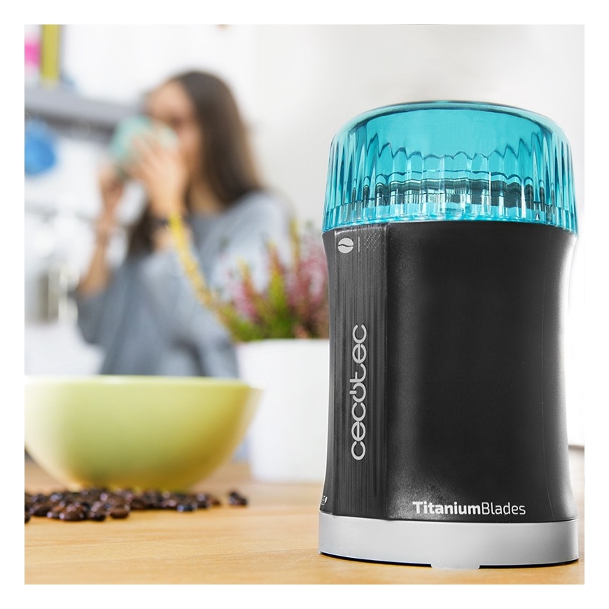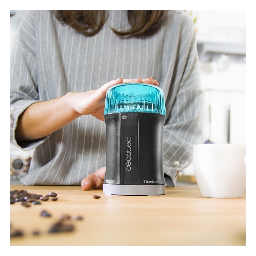 Cecotec TitanMill 200. Тип продукта: Ножевая кофемолка, Вместимость кофейных зерен: 50 g, Материал миски: Нержавеющая сталь. Мощность: 200 W. Не содержит: Бисфенол А
