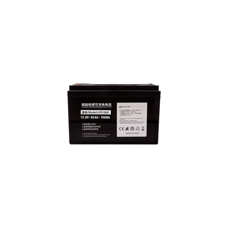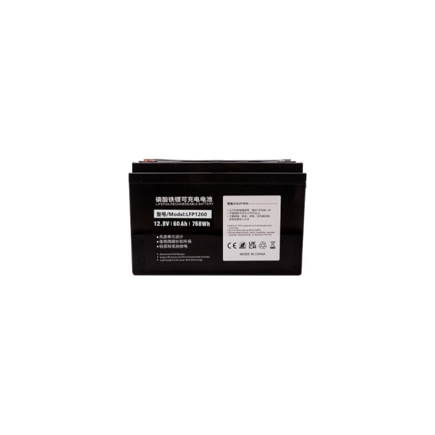 Battery LiFePO4 12.8V, of capacity 60Ah, 768 Wh. Lithium iron phosphate battery with exceptional durability, energy efficiency and charging speed for a wide range of applications Features: The new generation of lithium iron phosphate batteries offers high energy efficiency (up to 94%) and a wide operating temperature range.They are fast-charging, fully sealed (can be used in any position) and compact in size.As an energy storage system, the LiFePO4 battery is very environmentally friendly and has a wide range of applications.Compared to lead-acid batteries, LiFePO4 outperforms them in terms of durability (lasting up to 25 times longer), weight (twice as light) and high current capacity. This type of battery is non-flammable and non-toxic.LiFePO4 batteries have a very low self-discharge rate of 20% of their capacity in more than 10 years.Battery storage conditions: store up to 70 percent charged and charge every 6 months. Protect from heat.Applications: lighting, power tools, appliances, toys, emergency power supply, etc. Technical specifications: Battery capacity: 60Ah (768Wh).Battery type: LiFePO4 (lithium iron phosphate).Voltage: 12V.Nominal input voltage: 12.8V.Terminals: screws.Operating/storage temperature: up to 60°C.Color: black. Warranty: 24 months.