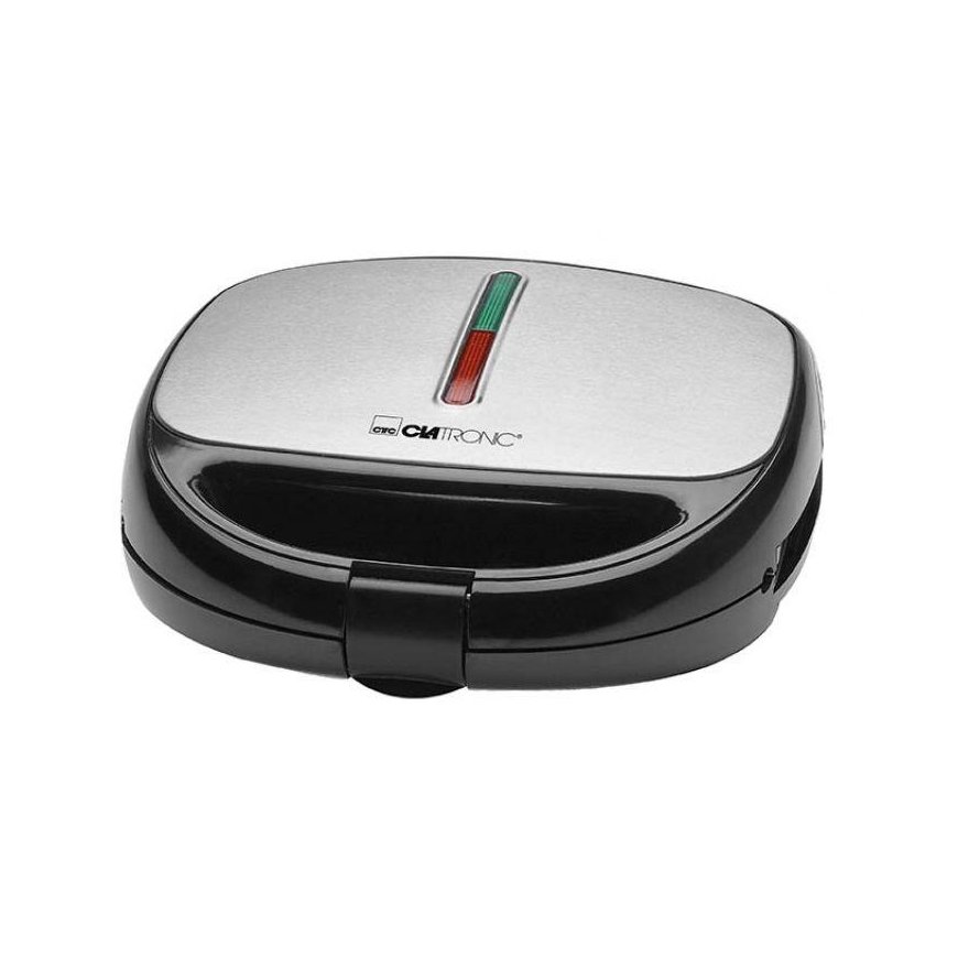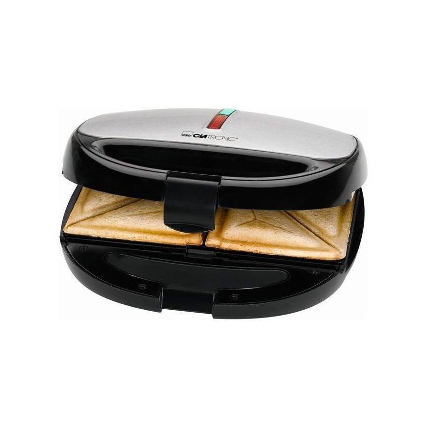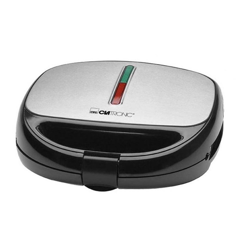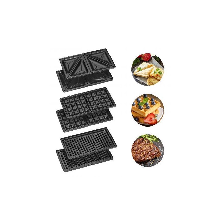 - Sandwich toaster, waffle maker and contact grill\n- Versatile use by three different removable plates (sandwich/waffle/grill plates), eg for Belgian waffles and tasty sandwich\n- variations, as well as for fast two-sided contact grilling \n- Stainless steel insert\n- Baking plates non-stick coated and changeable\n- Heat insulated handle\n- 2 control lights for power and heating (baking lights)\n- High stability through rubberized feet\n- Locking system \n- Overheating protection\n- 220-240 V, 50/60 Hz, 800 W