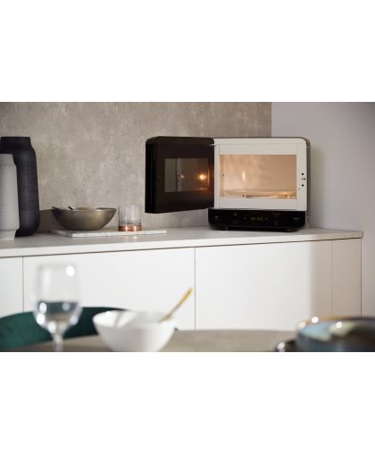 Оплати 5x35.80€This free-standing Whirlpool microwave has a unique round design. This appliance is the perfect solution for a small space, such as a kitchen corner. Despite the external dimensions, a normal 28 cm plate can fit inside.